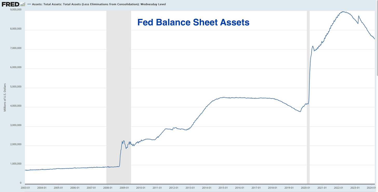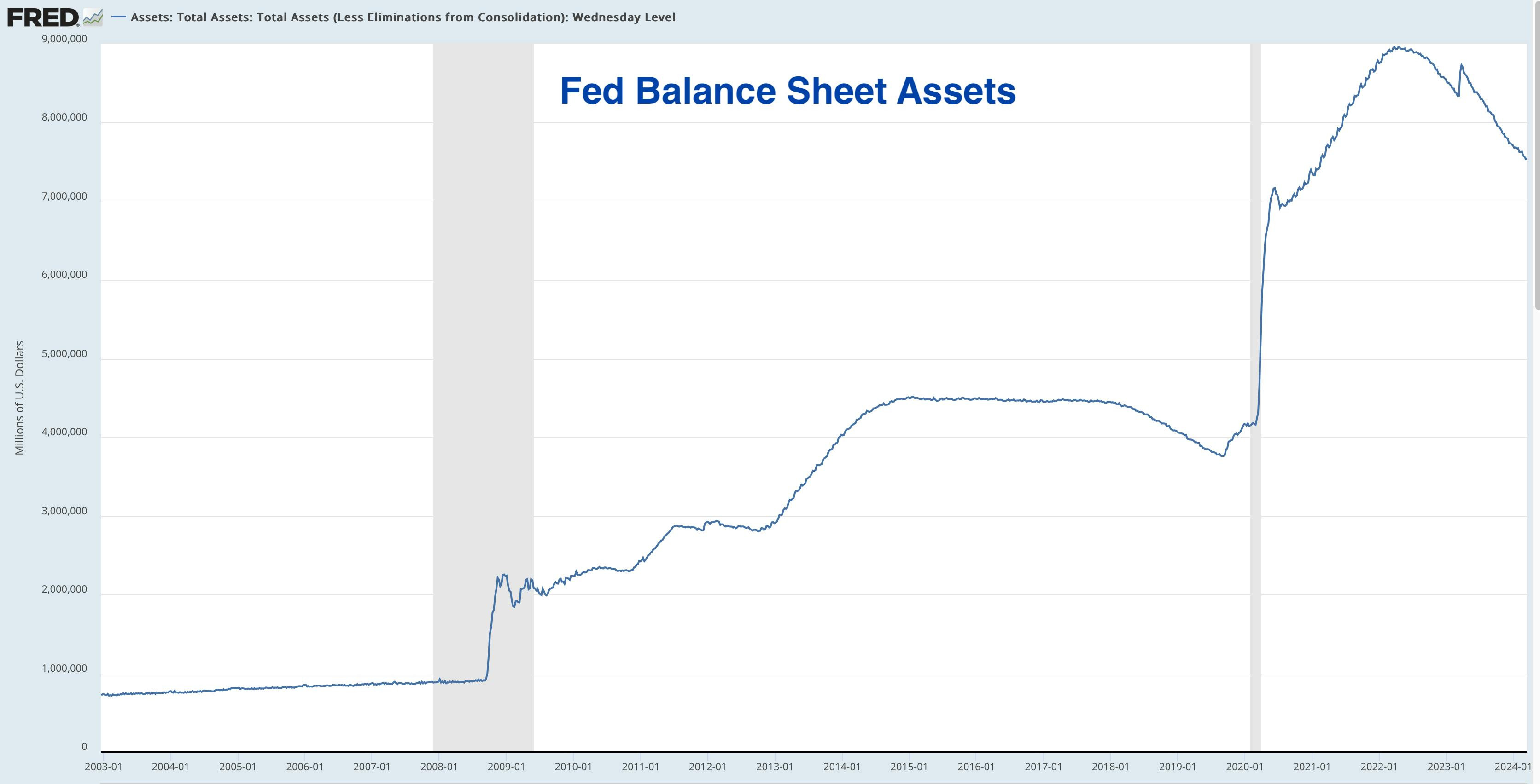 Se puede ver que la Fed ha estado reduciendo su balance vendiendo bonos del Tesoro americano que fue comprando en sus períodos de quantitative easing (QE) y títulos hipotecarios (probablemente de los comprados tras la crisis de 2008) y sobre todo permitiendo que los bonos venzan fuera de sus libros sin reemplazarlos con nuevos bonos, que es lo que suelen hacer. De hecho, cuando hablo de que el déficit tiende a crecer es un poco por esto: los gobiernos no pagan su deuda sino que emiten deuda nueva que reemplaza a la anterior, por eso todo lo que sea nueva deuda agranda el agujero.